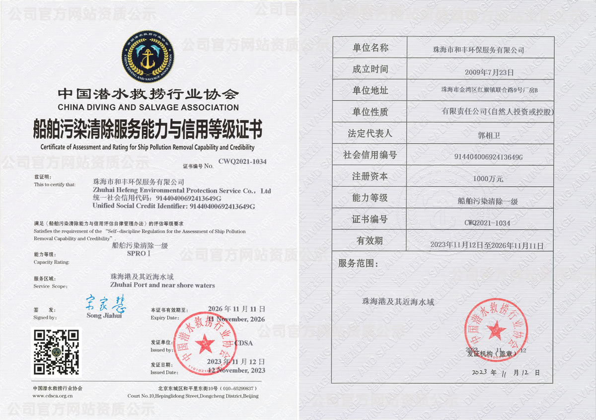 珠海市和丰环保服务有限公司成立于2009年07月23日,独立法人,公司注册地广东省珠海市,详细地址为:珠海市金湾区红旗镇联合路9号厂房B,注册资本为1000.00万,自有占地面积13753平方米的仓库,建筑面积17000平方米仓储、综合楼,船舶污染清除单位公示一级。公司拥有船舶防污染应急高级指挥4名,船舶防污染应急现场指挥10名,现场清污作业人员40名;清污主船2艘,辅助船8艘;设备有:WGS围油栏、岸摊围油栏、防火围油栏,动态斜面收油机,堰式收油机,船用喷洒装置,手持喷洒装置,溢油分散剂,清洗剂,吸油毡,化学吸附材料等等清污设备和材料。